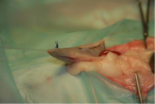Nach vollständiger Magenleerung werden Fadenzügel ca. 5 mm distal der Schnitt-Enden in der oberen Schicht der Magenwand (Subcutis und Serosa) gesetzt und somit die Inzisionskanten fixiert. Mit einer doppelten einstülpenden Naht mit 4/0 resorbierbarem Faden (bevorzugt Safil Faden-Nadelkombination) wird die Magenwand verschlossen.